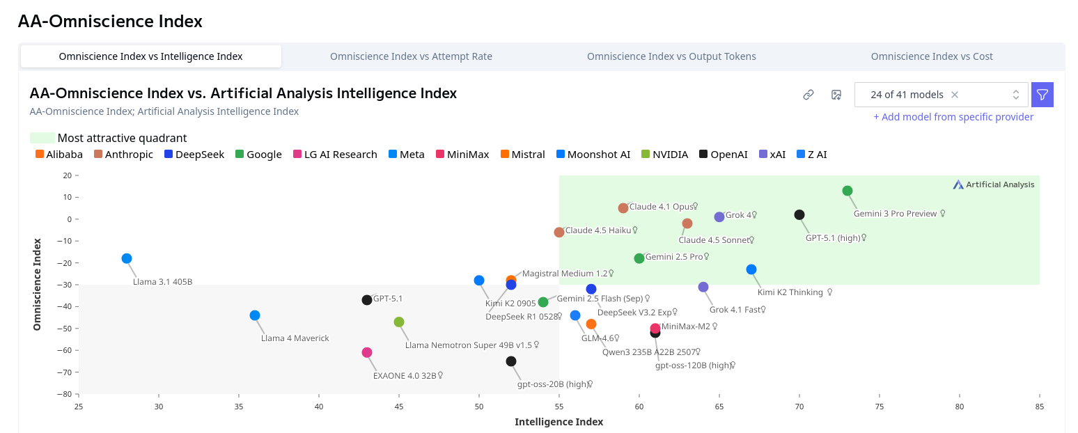 As one point of comparison in my Parlor puzzle LLM testing, I mentioned the Artificial Analysis "Intelligence Index" numbers. It seems to be a rather popular site for comparing LLMs, overall, and they have plenty of numbers to look at. More recently, I was reading their page for the dramatically named Omniscience Index. A potentially interesting idea, but one minor detail in their charts bothered me enough while reading to take a moment and write this.
