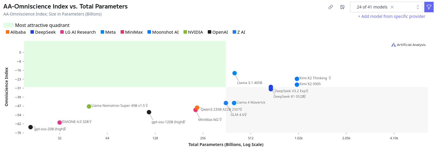 In the 2nd AA chart, for example, the "most attractive quadrant" includes models approximately below 400B parameters. Why exactly would that be the important threshold? For someone with a single 3090, the "most attractive" size would be more like ~32B and below.