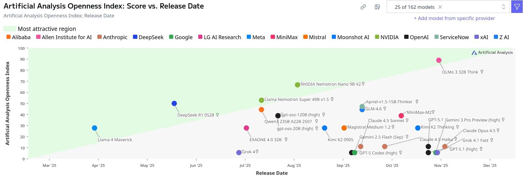 which manages to suggest a locked up model from 2024 is in the "most attractive" region, while a fully open model from 2026 would be sub-par. Nvidia's Nemotron super just manages to edge into the green zone. Luckily for them: if they released just a month later we'd have a problem. Even their usual misleading quadrants would be more appropriate here. (This is also all assuming the release date is even an interesting variable to plot by. We might assume quality correlates with release date, but they have their own "quality" numbers to plot against instead in that case!)