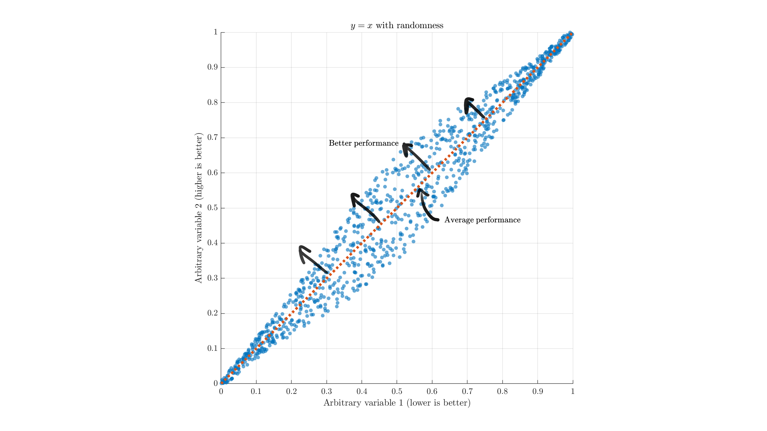 Suppose we had an overall y=x relationship between two variables, with different models varying slightly off the trendline. A plot might look something like this: