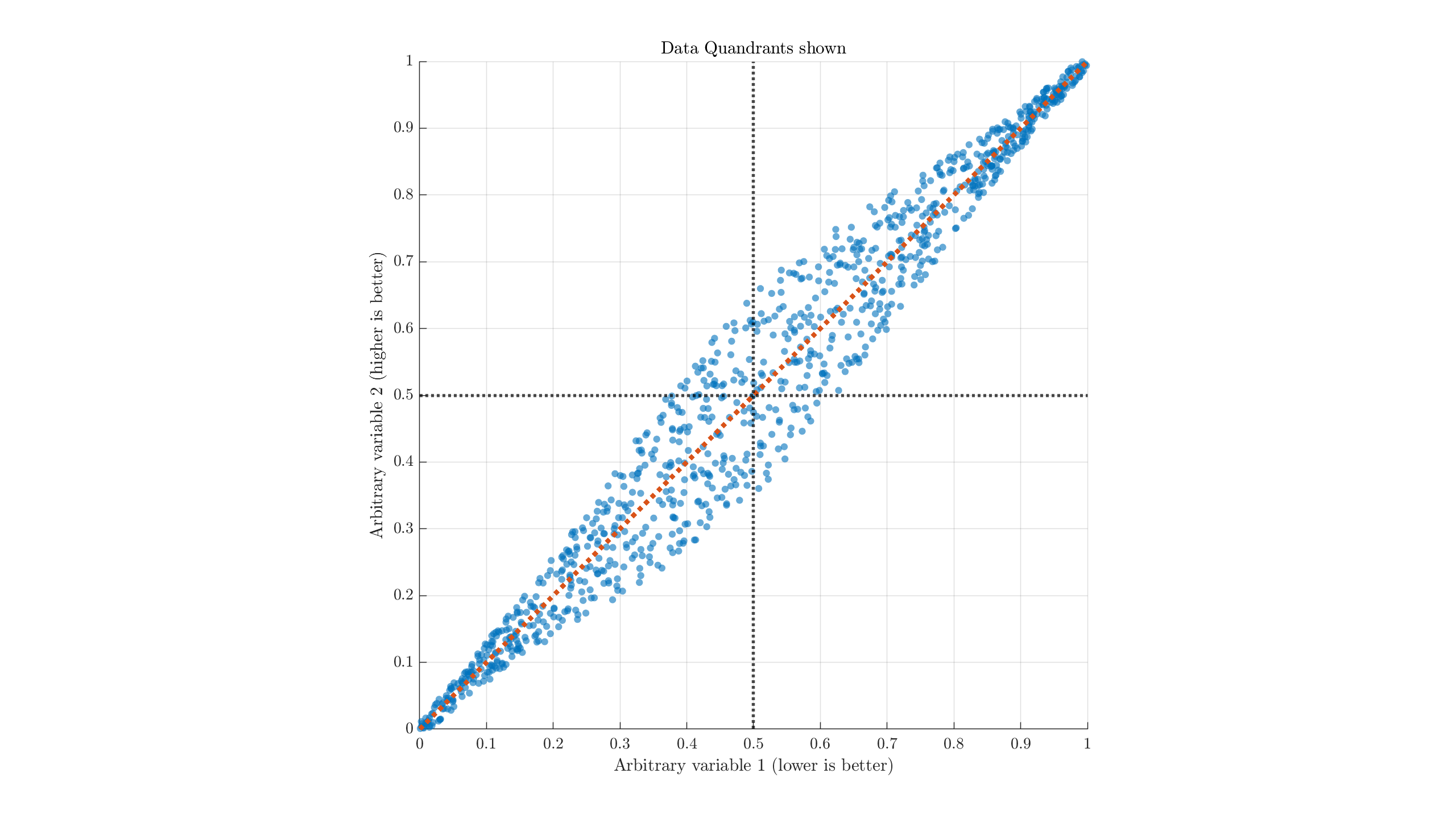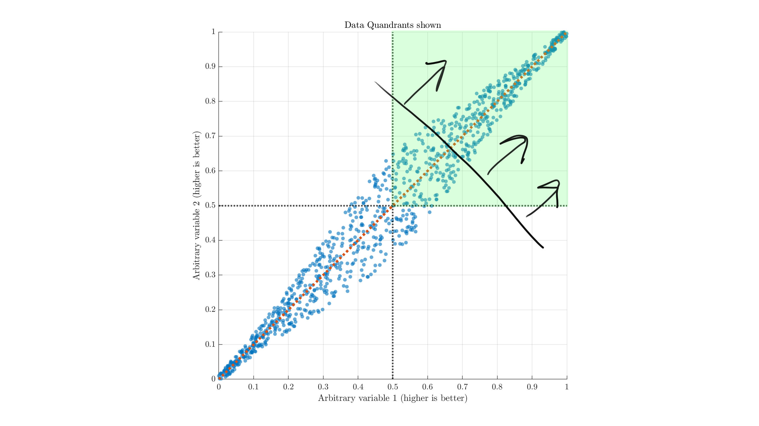 (Referencing off the black line and arrows, rather than the green quadrant. Move its base along the trendline depending on your standards, and maybe rotate depending on which metric you care more about.) These issues hold for nonlinear data relationships.
