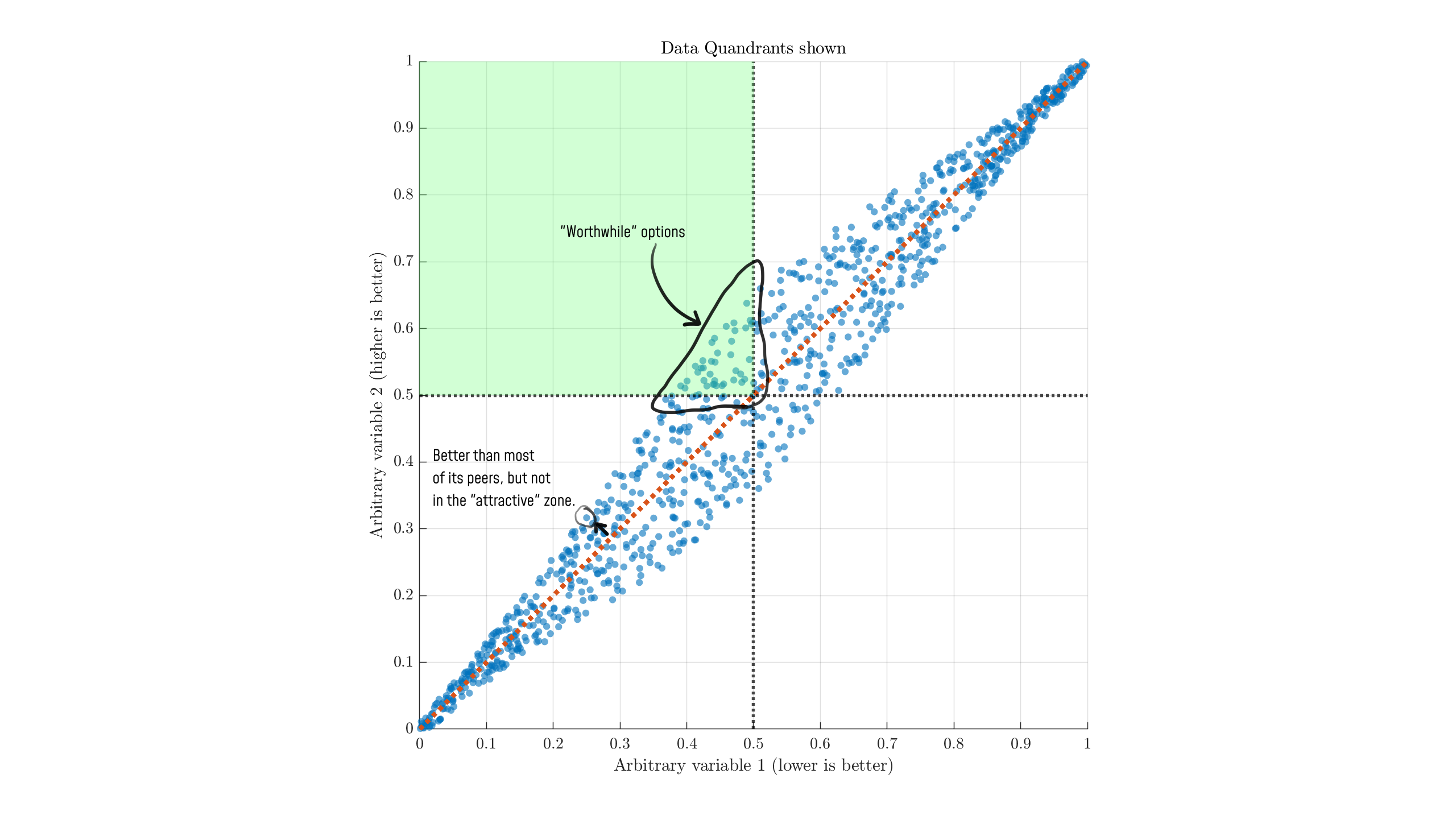 The real "worthwhile/attractive" options are those on the upper-left edge, across the entire range of the data (the Pareto frontier). Making arbitrary cuts around the mean values is not a good way to examine the data.