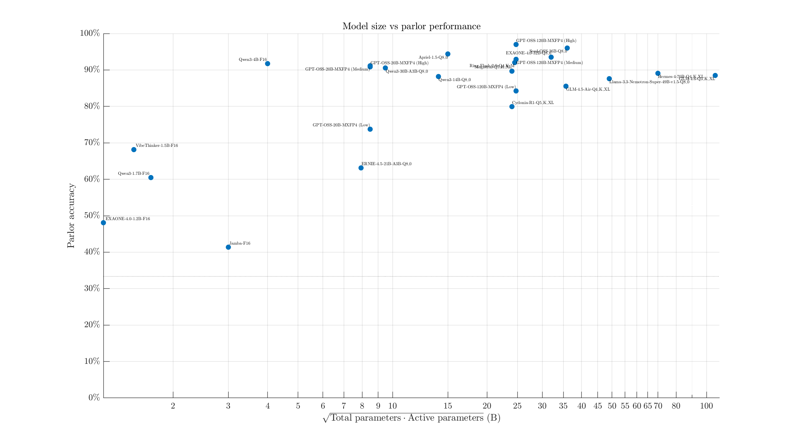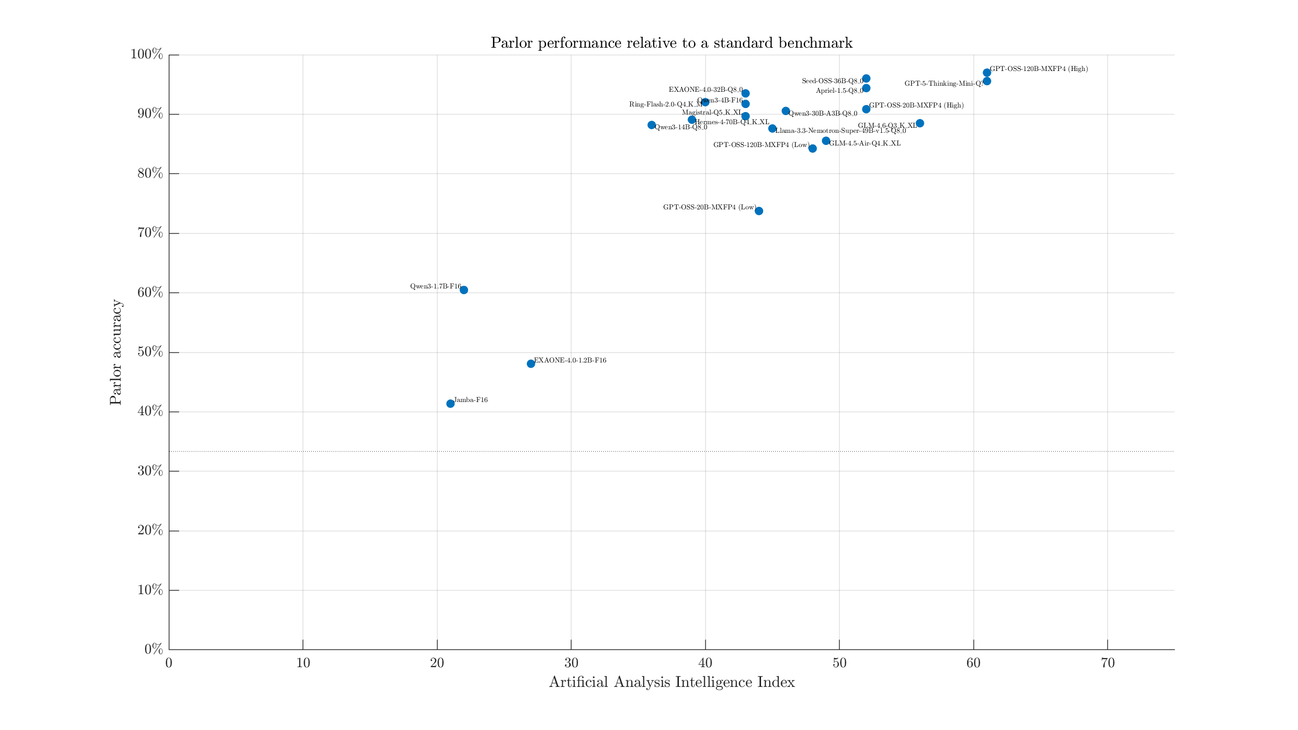 Artificial Analysis scores presumably represent the full precision of each model. Parlor accuracy scores, and plotted points, are run with the quants described. For instance, we could reasonably expect the GLM-4.6 at Q3 to technically have a slightly lower intelligence index score. Many of the models were tested at Q4+, many at Q8, so I think it should be close enough overall. I used the "medium" reasoning effort AAII score (61) to place GPT-5-Thinking-Mini. They do not seem to have a score for low, and high is marginally higher at 64. I did not specify a reasoning effort when doing this, if they even listen to the user prompt for that.