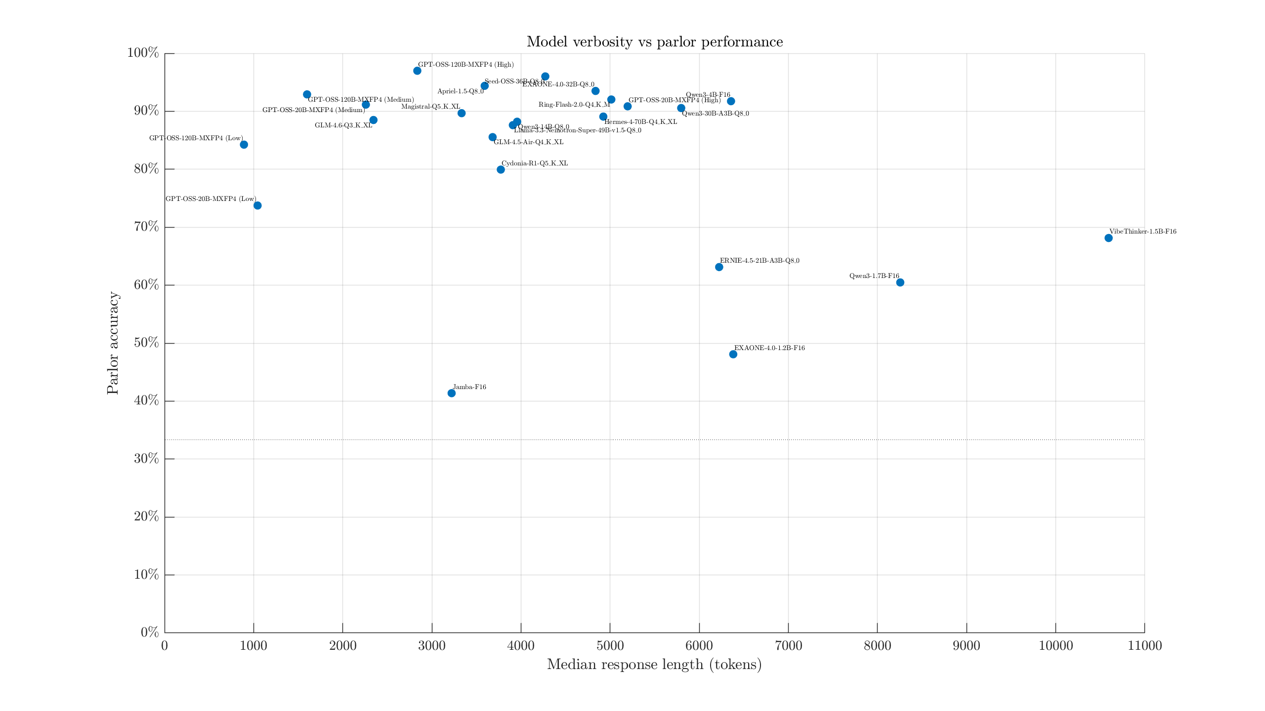 Setting aside model size, this contrasts performance with verbosity. Ideally, we'd want a model in the top left: high accuracy, few tokens to get there. GPT-OSS-120B most clearly occupies that spot.