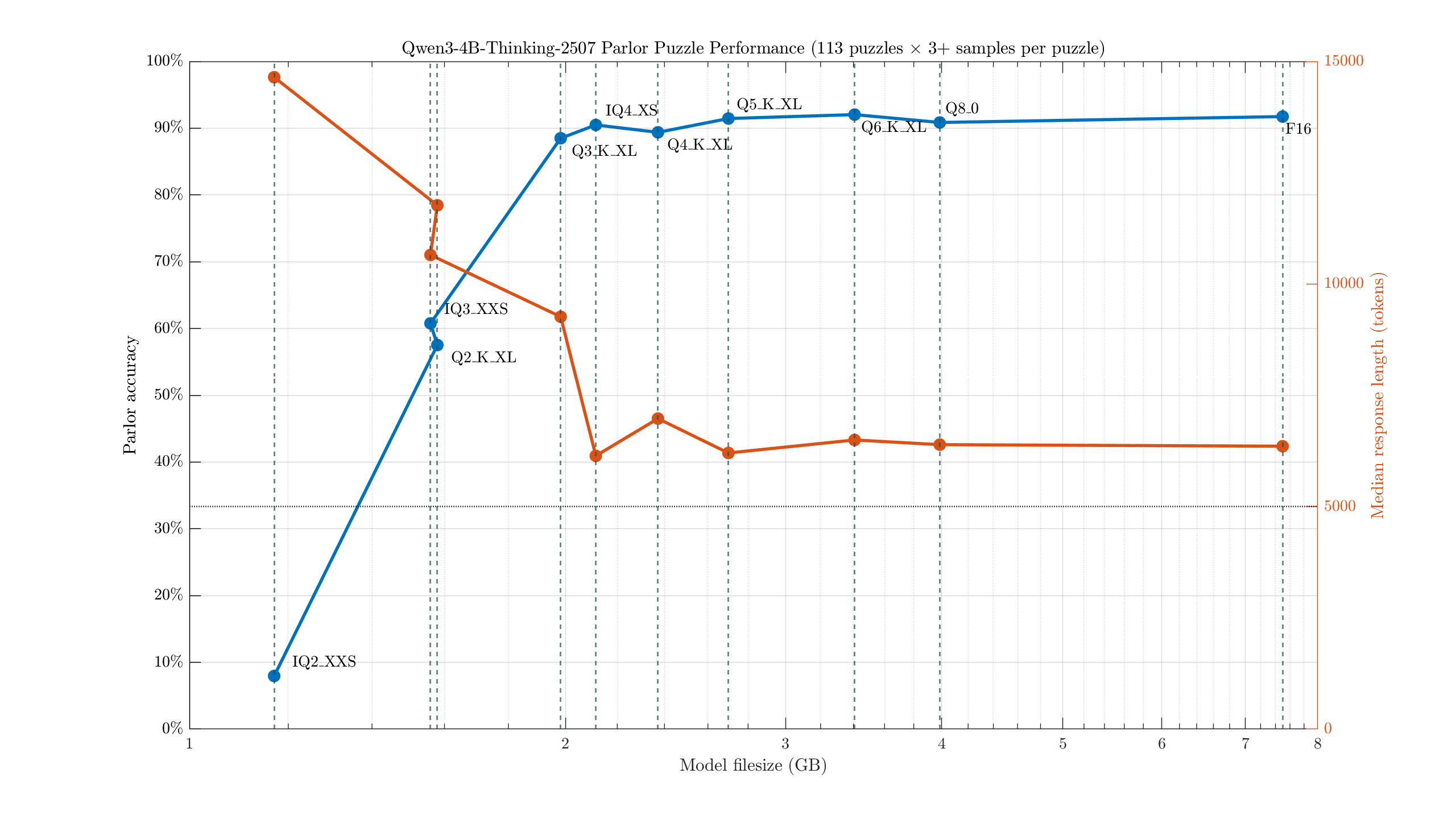 Interestingly, we see similar results to my factual LLM testing, with almost no noticeable change in performance until the 3-bit quants. Note that the IQ2_XXS model does worse than random guessing, mostly because it usually failed to produce any answer at all. It tended to get stuck somewhere in the reasoning process, and loop with text like "But wait" until running out of tokens.